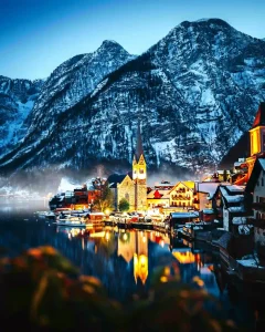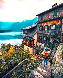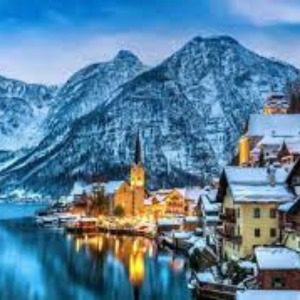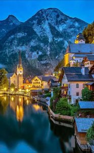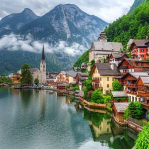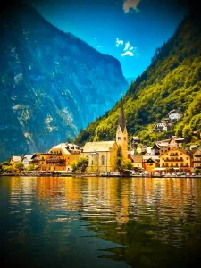 Hallstatt is a small village near a lake and mountain. It looks like a painting. People love to take pictures here. It is one of the oldest places in Europe.